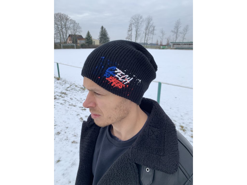 Pletený zimní kulich s logem Czech Fuckers v ručně malovaných barvách.